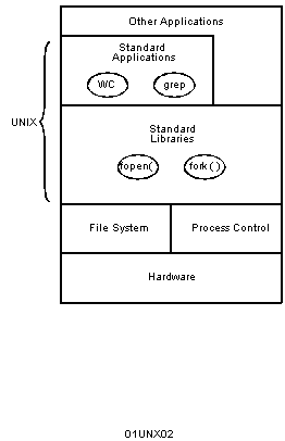 layers of UNIX. Sitting above the hardware are two components: the file system and process control. Next is the set of libraries. On top are the applications. The user has access to the libraries and to the applications. These two components are what many