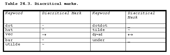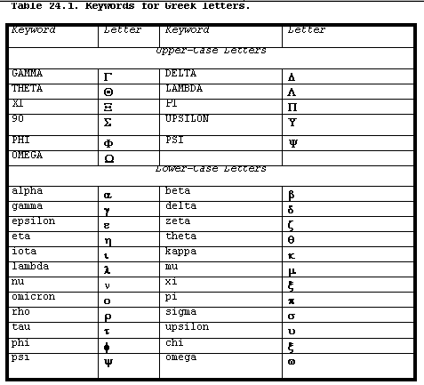 Table 24.1 lists the keywords for Greek letters.