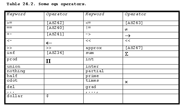 Besides selecting fonts for the characters in your equations, eqn provides you with a wide range of mathematical symbols, including the integral sign, upper- and lower-case Greek letters, plus, minus, equal sign, greater than, and less than.