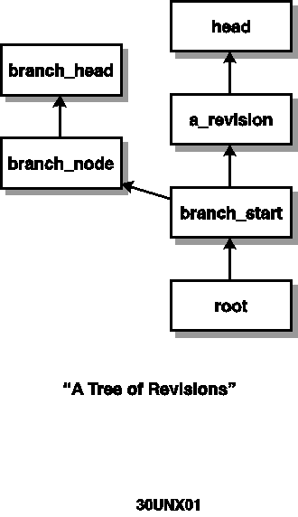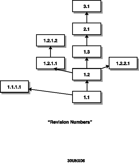 Source control systems store files as a series of revisions (in SCCS they're called deltas), a set of documents that evolved from each other, as a tree. See Figure 30.1 for a generic example. Refer to this figure as you read this section on source