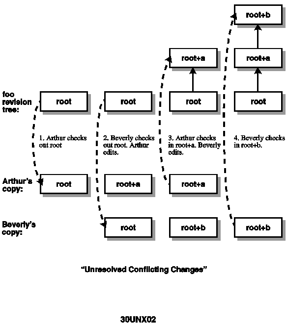 independently of Arthur. Arthur checks in his changes as revision root+a, reports to his manager that the changes are complete, and confidently flies to Belize for his two-week scuba diving vacation. Beverly checks in her changes as revision root+b, which