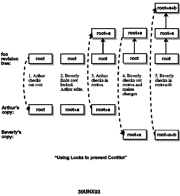 Compare this with the second time line (Figure 30.3). Arthur grabs a copy of revision root of foo, setting a lock on that revision, and begins editing it. While he is making changes, Beverly tries to grab a copy of revision root of foo, but the source