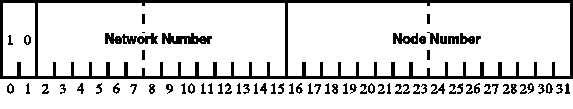 In a Class B address the 32 bits are split into 2 bits of 10, 14 bits of network number, and 16 bits of node number. (See Figure 37.2.) Allowing the address of 128 to equal a Class B broadcast, this leaves 16,383 Class B addresses with up to 65,534