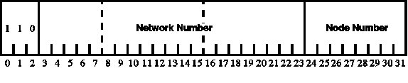 In a Class C address the 32 bits are split into 3 bits of 110, 21 bits of network number, and 8 bits of node number. (See Figure 37.3.) This provides 2,097,150 Class C addresses, with up to 254 nodes per network. Again, an address that is all 0s or all