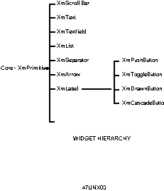 The Motif widget set is a hierarchy of widget types. (See Figure 47.1.) Any resources provided by a widget are inherited by all its derived classes. Consider the three most important base classes: Core, XmPrimitive, and XmManager.