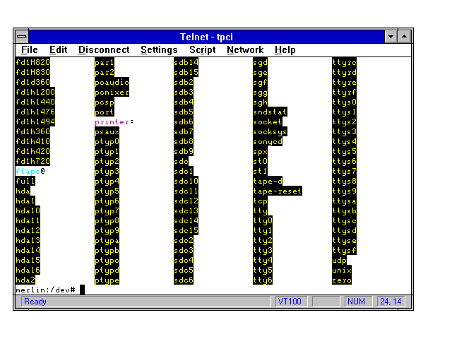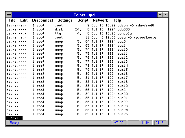 crw-rw---- 1 root uucp 5, 74 Jul 17 1994 cua10 crw-rw---- 1 root uucp 5, 75 Jul 17 1994 cua11 brw-rw---- 1 root floppy 2, 0 Jul 17 1994 fd0 brw-rw---- 1 root floppy 2, 1 Jul 17 1994 fd1 brw-rw---- 1 root disk 3, 0 Jul 17 1994 hda brw-rw---- 1 root disk 3, 1 Jul 17 1994 hda1 brw-rw---- 1 root disk 8, 1 Jul 17 1994 sda1 brw-rw---- 1 root disk 8, 10 Jul 17 1994 sda10 brw-rw---- 1 root disk 8, 11 Jul 17 1994 sda11 crw--w--w- 1 root root 4, 0 Jul 17 1994 tty0 crw--w--w- 1 root root 4, 1 Jul 7 18:16 tty1 crw--w--w- 1 root root 4, 2 Jul 7 17:58 tty2 crw-rw-rw- 1 root tty 4, 64 Jul 17 1994 ttyS0 crw-rw-rw- 1 root tty 4, 65 Jul 7 18:00 ttyS1
