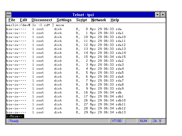 Linux allocated 16 minor device numbers to each SCSI disk device, with minor device number 0 representing the whole disk drive, minor numbers between 1 and 4 representing the four primary partitions, and minor numbers 5 through 15 representing any extended partitions. With Linux, SCSI disk minor device numbers are assigned dynamically starting with the lowest SCSI ID numbers. Figure 7.1 shows a listing extract from the /dev directory of the Linux system supplied on this book's CD-ROM. As you can see, all the SCSI hard drives have the major device number set to 8 and the minor device numbers vary from 0 to 15. The entire hard disk /dev/sda has major number 8 and minor number 0. The four primary partitions have minor numbers 1 through 4 (/dev/sda1 through /dev/sda4). Any extended partitions are numbered from 5 through 15 (/dev/sda5, /dev/sda6, and so on).