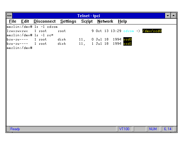 SCSI CD-ROMs use the major device number 11 and minor device numbers are allocated dynamically, with the first CD-ROM drive found being minor zero, the second minor one, and so on. The naming convention used with Linux is /dev/sr(digit), such as /dev/sr0 and /dev/sr1 for the first and second CD-ROM drive installed. Figure 7.2 shows the device drivers for a CD-ROM supplied with most Linux systems. Because a PC rarely has more than two CD-ROM drives attached, only two device drivers are usually included. As you can see from the figure, the /dev/cdrom device driver has been linked to /dev/sr0 (which is the first SCSI CD-ROM drive).