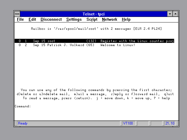 Elm and Pine are included with practically every distribution of Linux, although Elm is the most widely used at the moment so it's the mail reader this chapter examines first. If you decide to use another reader, check the documentation that accompanies the reader for configuration details. If you want to get going quickly with a very good reader, configure Elm or Pine on your system based on this chapter. You can have as many mail readers configured at a time as you want, so start with Elm or Pine and move on if it doesn't meet your needs.