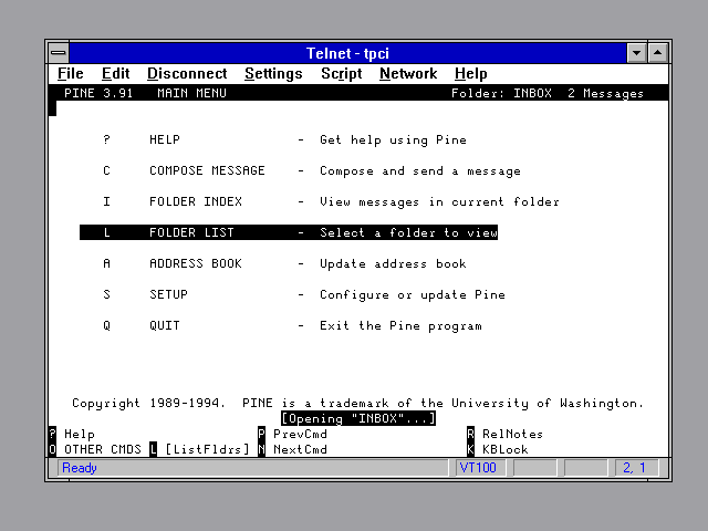 Most mail readers will have a configuration file similar to Elm's that controls the access and behavior of the mail reader. The most commonly available is Pine (Pine Is No longer Elm), also a full-screen mail reader, as shown in Figure 37.2. Pine can use system variables to a large extent, but it can also be customized by users.