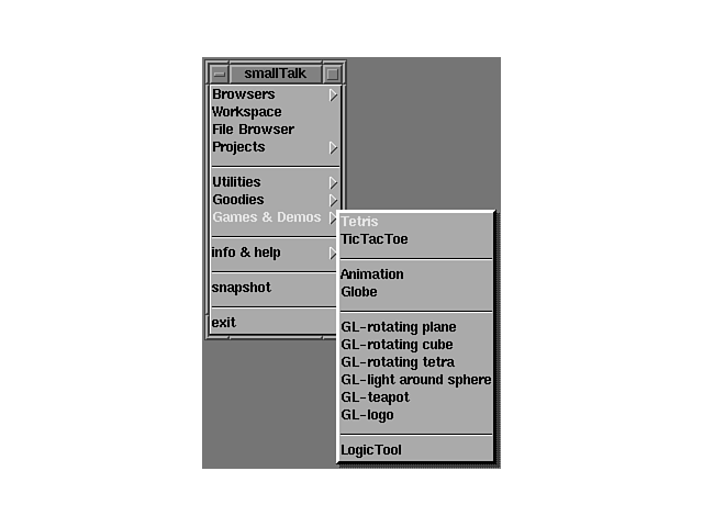 | info & help | This contains topics that give you help and information on the ST/X environment and programming in Smalltalk. |