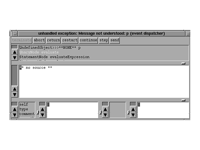 ST/X was started. If you type ? at the miniDebugger prompt, you will get a list of commands that are available for use in this stripped down debugger.