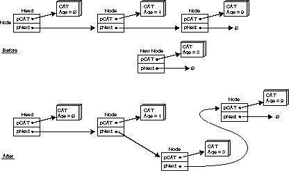 Insert() is the most powerful member function in the class. Insert() maintains the linked list and adds Nodes to the list based on the age of the CAT that they point to.