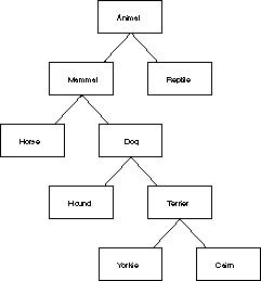 The concept dog inherits, that is, it automatically gets, all the features of a mammal. Because it is a mammal, we know that it moves and that it breathes air--all mammals move and breathe air by definition. The concept of a dog adds the idea of barking, wagging its tail, and so forth to that definition. We can further divide dogs into hunting dogs and terriers, and we can divide terriers into Yorkshire Terriers, Dandie Dinmont Terriers, and so forth.