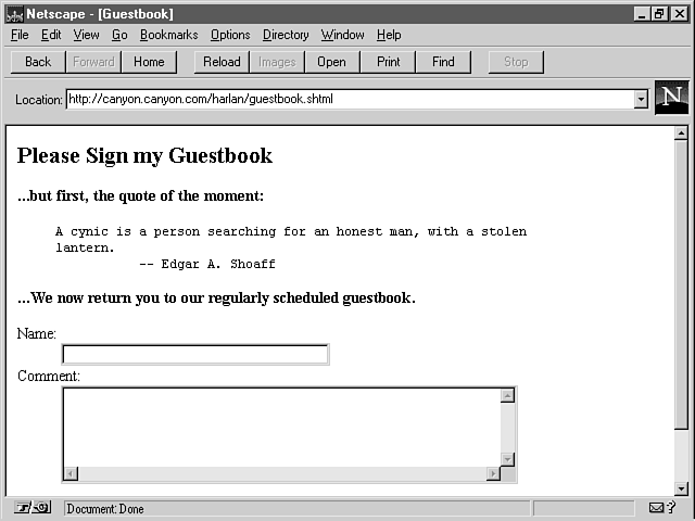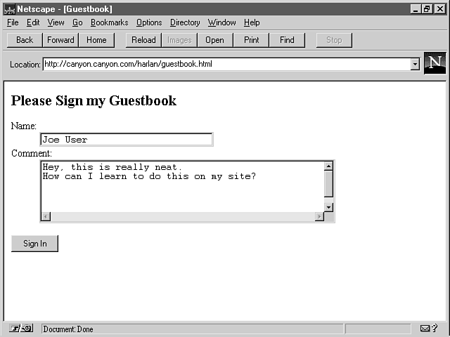 Undoubtedly, one of the first uses of CGI that you experienced was filling out and submitting a form. Perhaps that form looked something like the Guestbook sign-in form shown in figure 2.1.