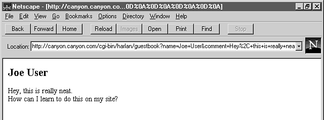 The changes in this script introduce one new CGI concept and a couple of new Perl commands. As pointed out earlier in this section, the URL in the Location box shown in figures 2.5 and 2.6 has additional information tacked on at the end. At first glance, this information might seem to be a bit odd. In figure 2.5, it appears that you're calling a script called 232 in the /CGI-BIN/HARLAN/SHOWGUESTBOOK2 directory. Clearly, that's not what's happening, though.
