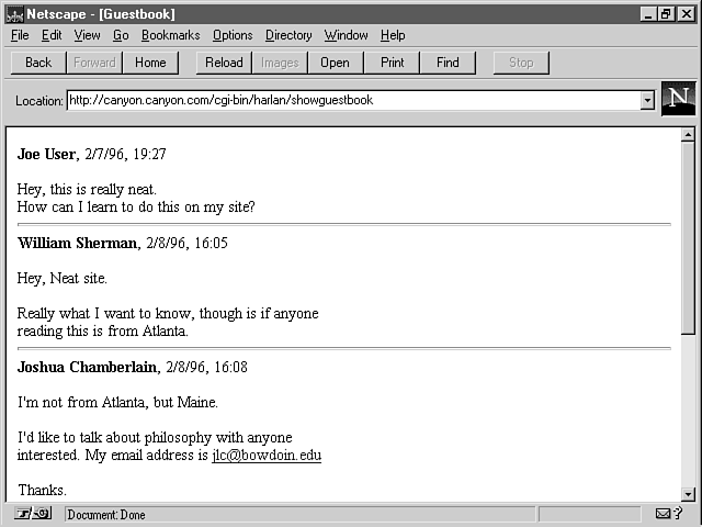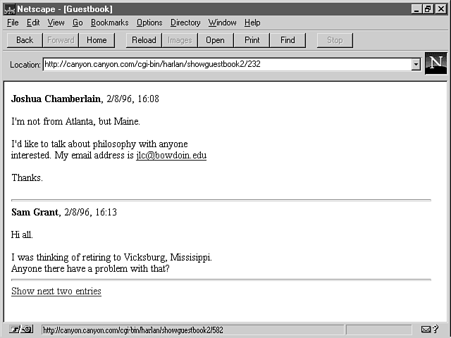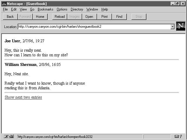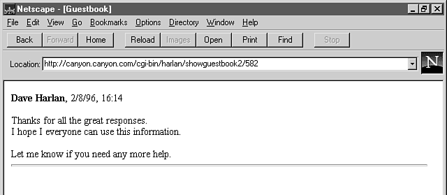 At this point, you may be curious about why I didn't just write the Guestbook information to a straight HTML file in the first place, so that the user could just call up that file to look at the Guestbook list. Certainly, that method is an option, and many guestbook programs do just that. But this method provides some additional flexibility that straight HTML can't offer.