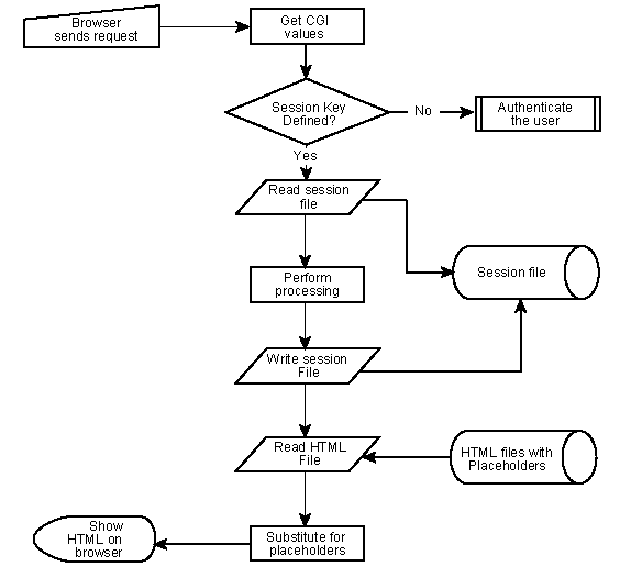 Notice the overall level of program flow. The browser sends CGI values to the wrapper script; the wrapper script process the values, updates stored values, and returns HTML to the browser. The process starts again when the user submits the form or follows a hyperlink that leads back into the system.