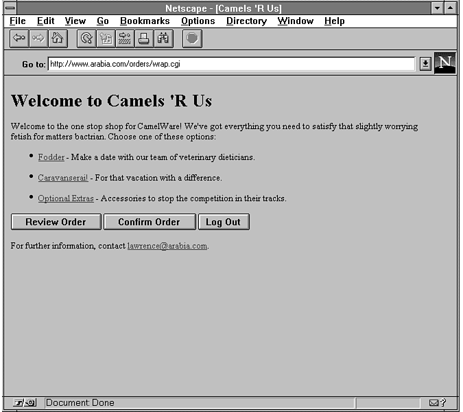 Finally, the order that you have so carefully built must be confirmed by the user and written to a file. Order confirmation is triggered when the user clicks one of the many Confirm Order buttons that you have helpfully scattered around the various forms. The CGI data that arrives back at wrap.cgi then contains the setting action=Confirm+Order, which is caught by &DoAction; then &ConfirmOrder is invoked.