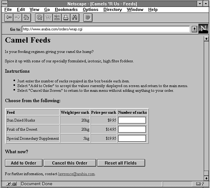 A user builds an order by using the three order forms shown in figures 9.3, 9.4, and 9.5 (refer to "Program Flow" earlier in this chapter). These forms work in the same way, so this section focuses on only one: the Feeds form. The source for the form is stored in feeds.htm. The relevant lines for the first product are as follows, with the other products being set up in an identical fashion: