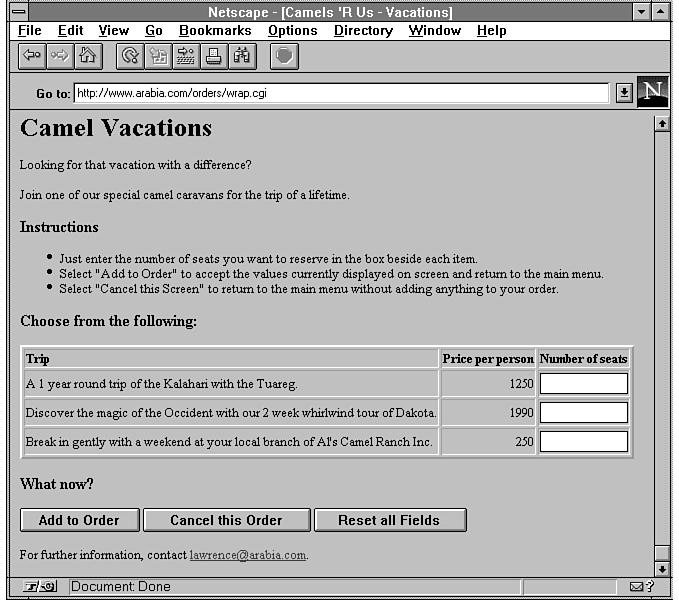Notice that a statement such as this must be generated by a CGI program. The values Kurt, Blue, and 0 are decided only when the user fills in form B, so these values cannot be hard-coded into a HTML file on disk.