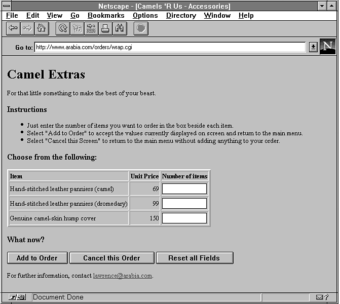 The example application in this chapter is a shopping-cart-style ordering system for Camels 'R Us, which sells three types of products: food, vacations, and accessories. You will develop an interface that allows authorized users to browse product menus; build up a list of purchases; review the order; and, finally, submit the order. At that point, your program simply writes the order details to a file. In real life, the order could be passed on to an ordering database.