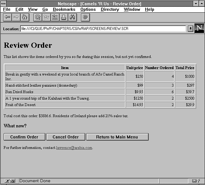 It is reasonable to expect that the user may want to review the order before confirming it. She can do so by selecting Review Order from any of the menus. This option passes a CGI value of action=Review+Order to the wrapper script. This value is trapped by &DoAction, causing &ReviewOrder to be invoked.