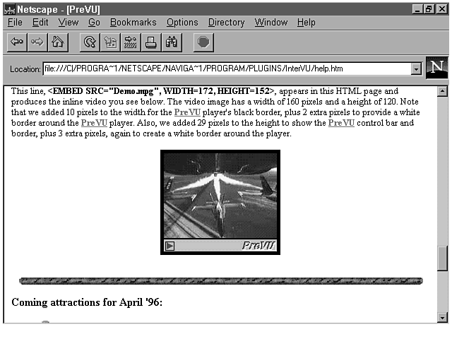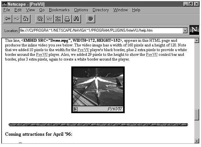When the Navigator starts up, it scans its Plug-ins folder and "registers" a given MIME type to the corresponding plug-in that can read files of that type. Then, when that type is encountered in a Web page, an instance of that plug-in is loaded into memory and the information is used in one of three ways. It may be displayed inline (as in the MPEG file example in figure 10.3) which is also called embedded; full page (for example an Adobe Acrobat file in figure 10.4) where the entire window under the nav-buttons is occupied by the plug-in; or hidden (as in the case of a MIDI sound player which may not have any information displayed in the window, but plays in the background).