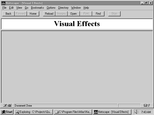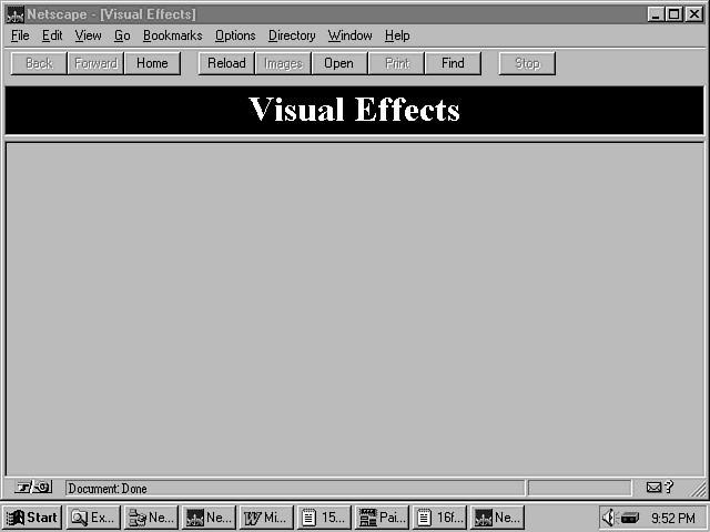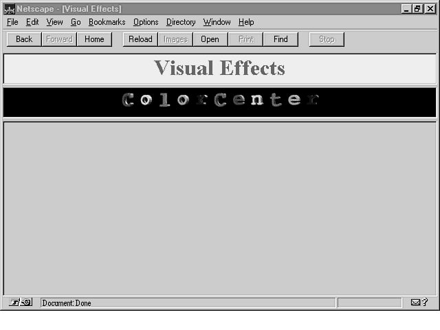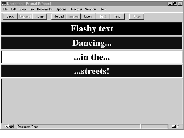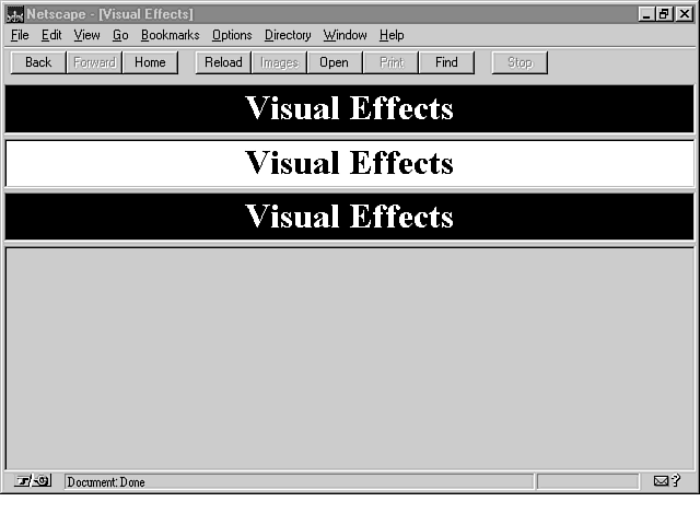 One of the easiest visual effects to create is a color alternator, which switches between two color schemes in a frame. This effect is best used in small frames containing large, bold headlines. It should not generally be used with smaller, detail text, as it will make such text difficult to read while the effect is in progress. It would also be wise to use this effect in moderation-a brief burst of alternating colors can be very effective when your page first loads, when making a transition to a new topic, or to underscore a point. However, continuous flashing quickly becomes annoying to the viewer. (Remember the fate of the BLINK tag!)