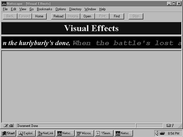 When our example page is loaded, the head frame will alternate rapidly between white-on-black and black-on-white. The entire effect lasts less than one second. The output is shown in figures 15.1 and 15.2.