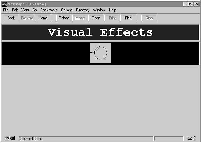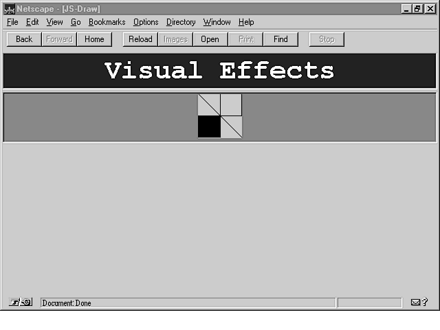 Note, however, that once an xbmImage has been displayed, any subsequent changes to it will not be displayed when you redraw the frame. Netscape assumes that images of a given name don't change, so it uses its cached copy after the first draw. The workaround is to assign the xbmImage object to an object with a different name and then redraw it. The JS-Draw application, shown in the next section, uses an array for this purpose.