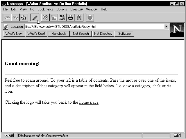 As mentioned, Navigator Gold is great for formatting the visual content of a page, but currently lacks control over the underlying structure (the tags). Therefore, you'll use a combination of Navigator Gold and NotePad to create your pages in this example.