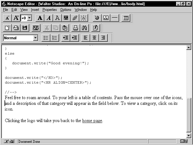 This directs the document load into the "body" frame (where the article bodies are displayed). Because you have to use NotePad to insert or edit your JavaScript code eventually, however, you might want to wait to make visual changes before you have to resort to a straight-text editor.