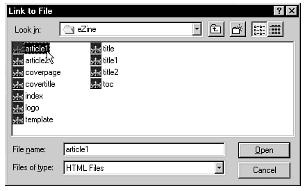 The table of contents (located in the lower-left frame) serves as your control center. All article links are listed here. When the user passes the mouse over one of the links, a line of text describing that link appears in the browser's status bar. For your eZine, you'll have two "article" documents so you need to lay out the TOC.HTM file with two links to files ARTICLE1.HTM and ARTICLE2.HTM (which, for now, can be made using the JavaScript template). Creating a link with Gold is very easy if you follow these steps: