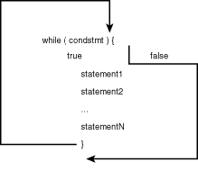 The condition clause condstmt is evaluated as a logical expression. If it is true then the block of statements between the braces is executed. The flow of control then loops back to the top of the while statement, and condstmt is evaluated again. This process continues until the condstmt becomes false, or until some statement within the block forces it to terminate. Each pass through the block of code is called an iteration. Figure 2.4 illustrates the basic structure of a while statement.
