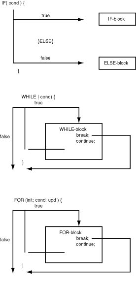 The for clause, as shown, has three parts, separated by two mandatory semicolons. The initstmt is typically used to initialize a variable, although any valid statement may be used in this position. The initstmt is always executed exactly once, when the for statement is first encountered. The condstmt is a conditional test, and serves exactly the same function as in the while statement. It is tested at the top of each loop. The for statement terminates when this condition evaluates to false. The updstmt is executed at the bottom of each loop, as if it were placed immediately after the last statement in the for block. It is typically used to update the variable that is initialized by the initstmt.