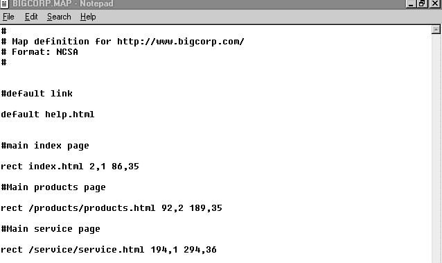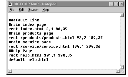 To determine which parts of the image map are linked to which URLs, the map server program must have a map definition file at its disposal. This file is generally a text file with the extension MAP, stored somewhere in the CGI-BIN directory for your Web site. Exactly where this file is stored depends on the combination of your Web server and map server. Let it suffice to say that you'll need to consult your server's documentation or your ISP.