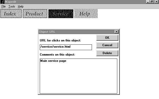 Available for all flavors of Windows (Windows 95, Windows 3.1, and Windows NT) and for most types of UNIX, MapEdit is a powerful program that allows you to graphically define the hot zones for your image maps. You can access and download the latest version of this program via the MapEdit Web site (http://www.boutell.com/mapedit/).