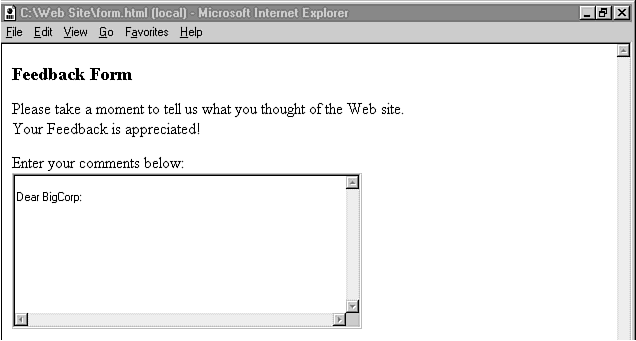 I mentioned before that <TEXTAREA> is commonly used to gather feedback from your Web users. To create a small form to do just that, save your default template as a new HTML document and enter the following: