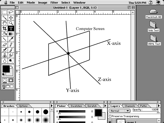 The other thing you need to do with VRML is switch over to a 3D way of thinking. Many VRML objects and commands have coordinates, which include X, Y, and Z components, usually in that order. On your screen, X is left and right, Y is up and down, and Z is from the back of your head to the back of the monitor.