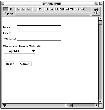 Finally, PageMill makes form creation very graphical and understandable. Although you'll still need to edit manually to add JavaScript and similar elements, the basic server-side form is a cakewalk to create.