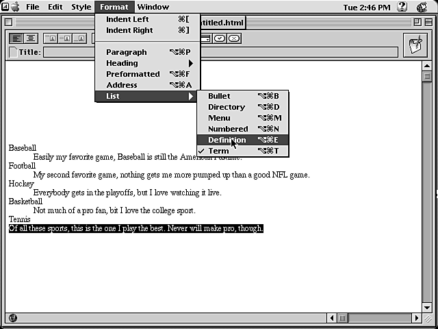 Definition lists aren't remarkably different than other list types in PageMill, except that they take a bit more effort. Since nothing can be assumed about definition lists, you may need to select and change each line individually. For instance, enter the following plain text: