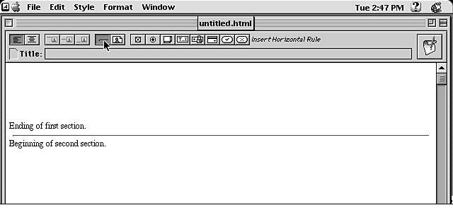 Next, add a horizontal line after the paragraph of text. Simply place the cursor in the blank space and click the horizontal line button on PageMill's button bar. (You may also want to add space on either side of the HR.)