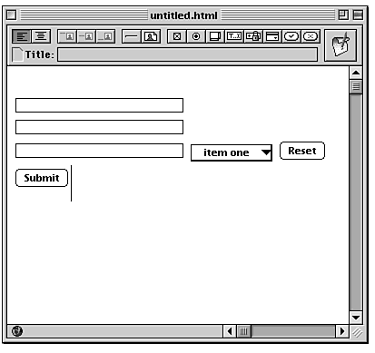 For example, create three textboxes and a pop-up menu using the PageMill buttons. You might also want to create a Reset button, and you should definitely create a Submit button. After you've done that, you'll have a page that looks something like figure 29.9.