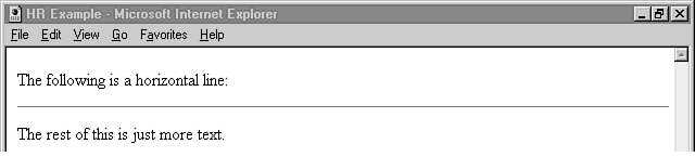 All other tags in HTML fall into one other category, called empty tags. These tags have only an on tag-there are no off tags. The reason for this is that empty tags don't act on blocks of text. Instead, they do something all on their own. An example of this would be the <HR> (horizontal rule) tag. This tag draws a line across the width of your document. For example: