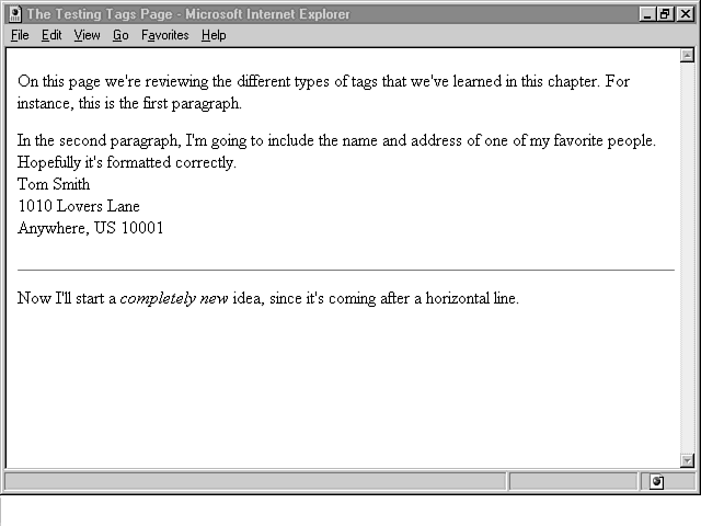 When you've finished entering the text and tags (you can use your own text if you like; just try to use all of the tags we've reviewed in the chapter), use the Save command in your text editor. Now switch to your Web browser, and load your new page using the Open File (or similar) command.