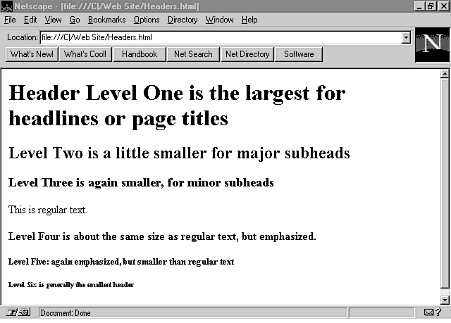 Header tags are containers, and unlike many other HTML tags, they double as paragraph tags. Ranging from level 1 to level 6, headers allow you to create different levels of emphasized headlines to help you organize your documents. The following is an example; see figure 7.1 for the results: