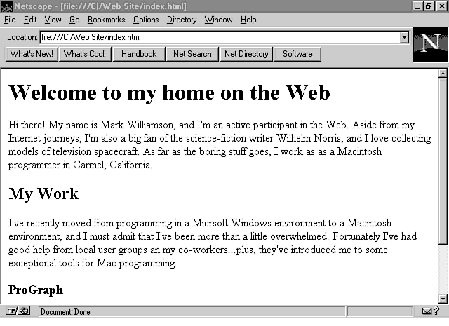 When you've finished entering this text, save the file again in your text editor, then choose the Load File command in your Web browser to display the HTML document. If you have other Web browsers, see how those respond to the tags, too (see fig. 7.4).