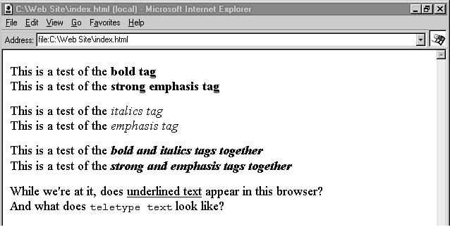 Here's a great way to kill two birds with one stone. With this example you can get a feel for using both the physical and the logical tags discussed above. At the same time, you can also test these tags in your browser to see how they're displayed. (If you have more than one browser, test this example in all of them. That way you can see how different browsers interpret logical tags.)