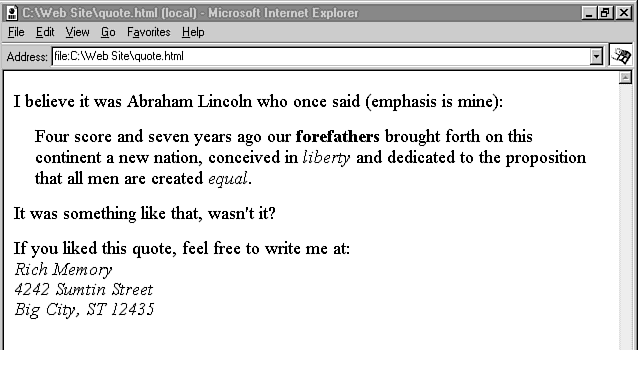 What does all of this look like? Take a look at figure 7.5. <BLOCKQUOTE>, unlike some of the tags you've looked at, really does offer unique abilities that make it worth using in your documents.